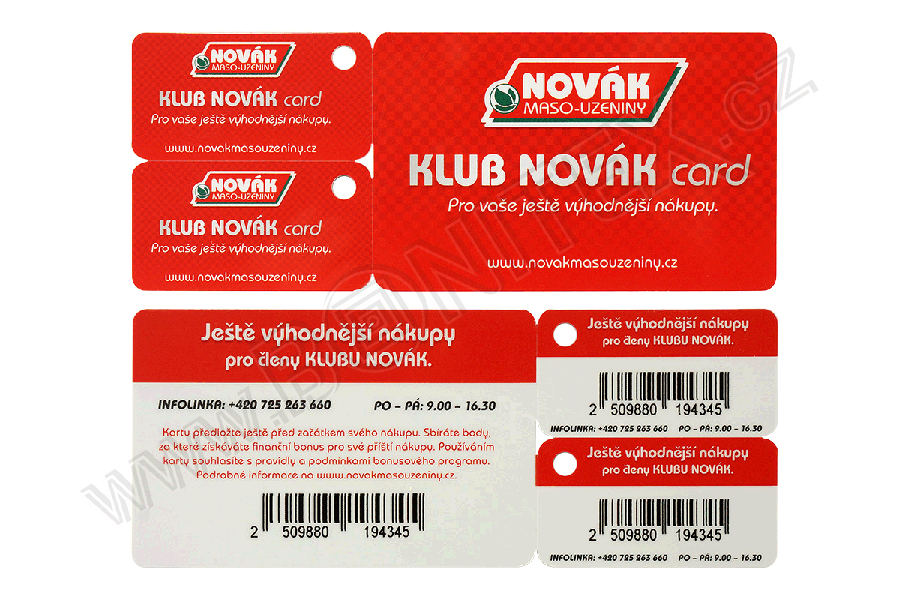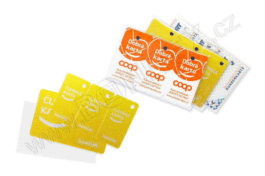Klassische Karte in Kreditkartengröße (CR-80) mit einer zusätzlichen beigefügten Karte (CR-80), die zum Zerbrechen in drei gleich große Minikarten mit Löchern, zum Anhängen an den Schlüsselanhänger des Nutzers, vorbereitet ist. Beide Karten sind gepaart (gleiche EAN-Codes) und in einer gemeinsamen PE-Hülle verpackt.